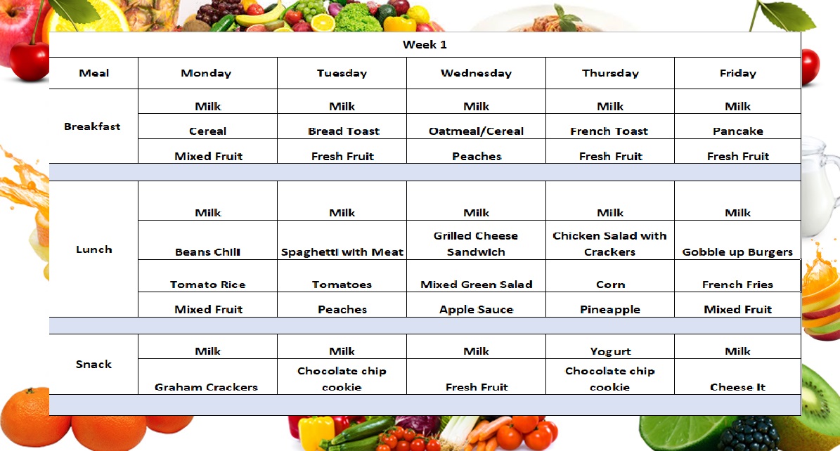 Our child nutrition program includes breakfast, lunch and two snacks – one in the morning, one in the afternoon. Every lunch and snack is nutritionally balanced and meets requirements regarding food components and portion size.