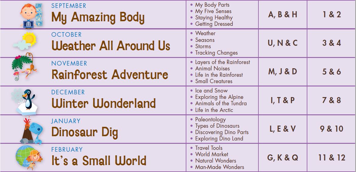 Language – Children will develop Language Development and Listening Skills that include: color words, shapes, animals, transportation, countries, community helpers, health, safety, manners, and science.